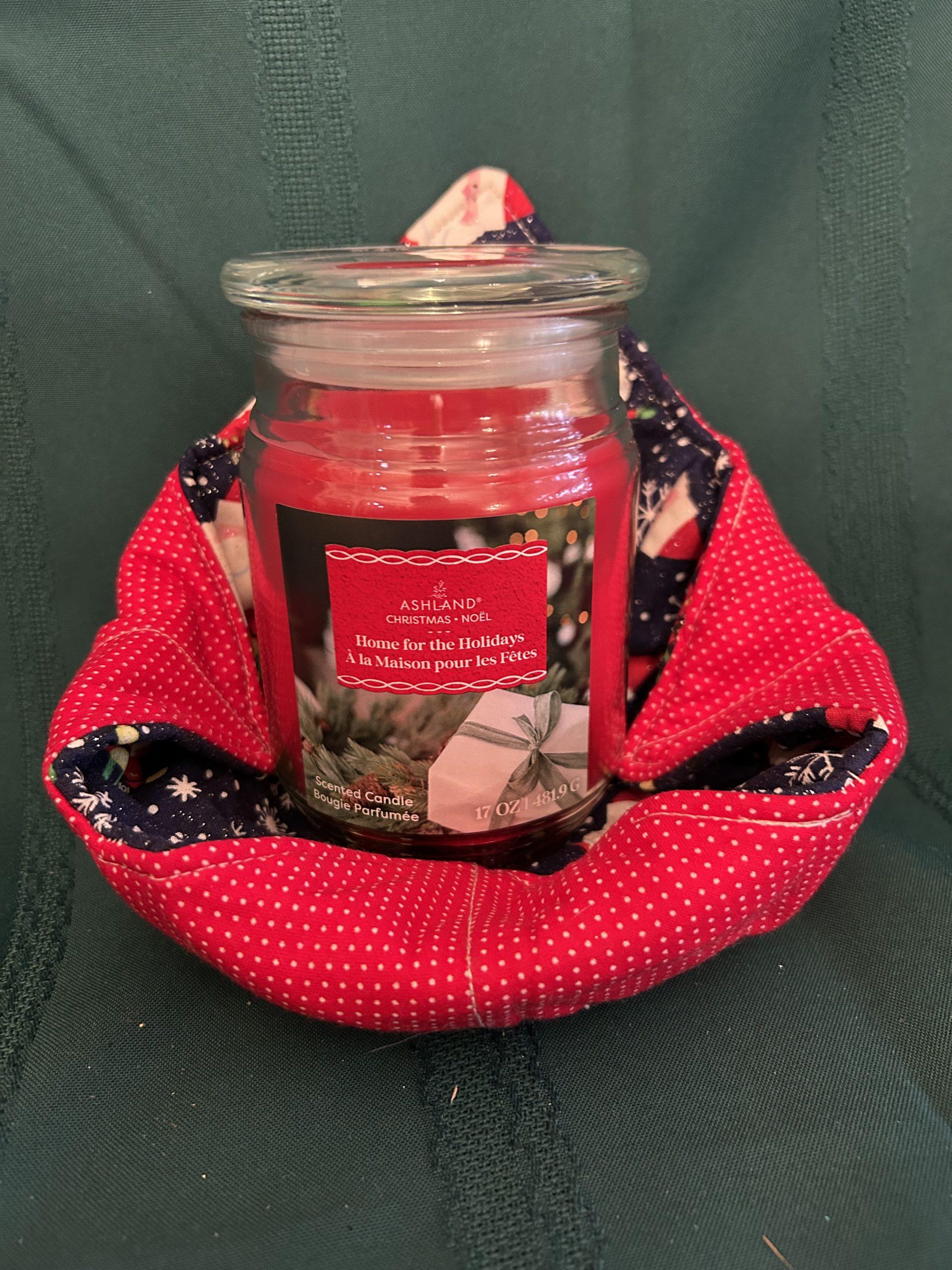 Microwave coozie in Christmas design with Ashland Christmas Candle in jar, “Home for the Holidays”.