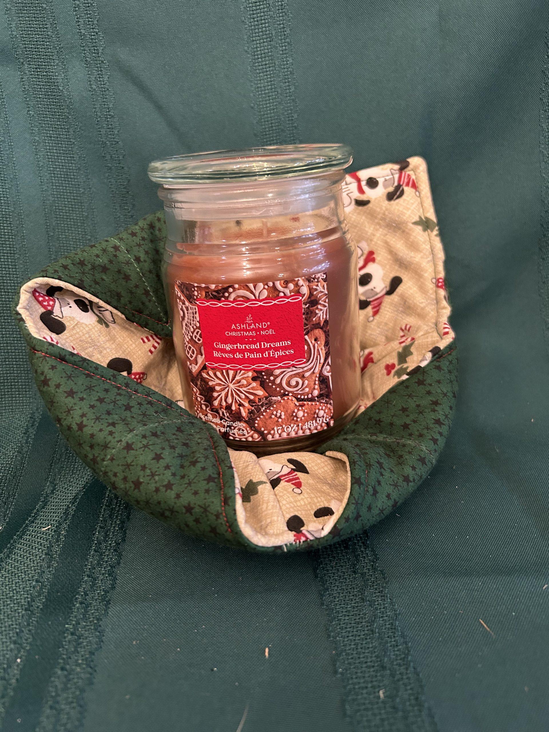 Microwave coozie in Christmas design with Ashland Christmas Candle in jar, “Gingerbread Dreams”.