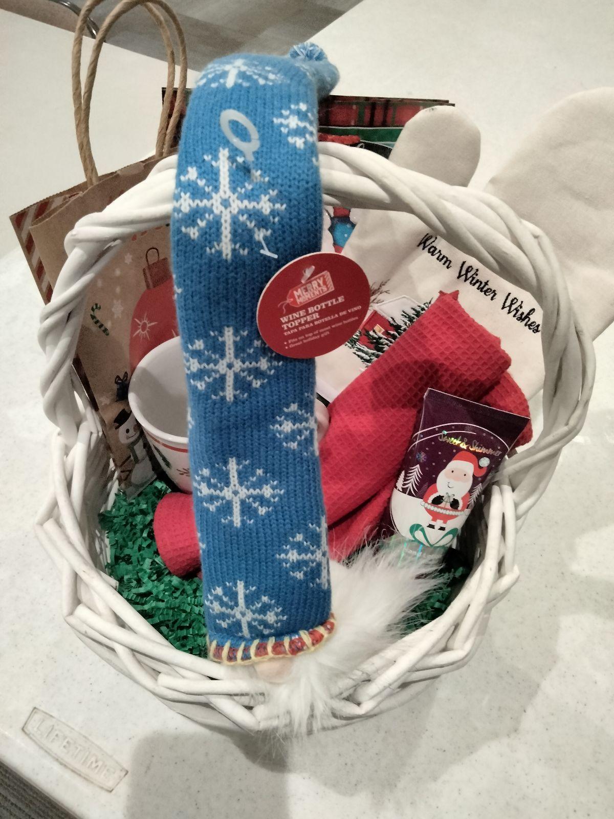 A Christmas themed basket with a Christmas card, lotion, gift bag, mug, towels, and a gnome wine topper.