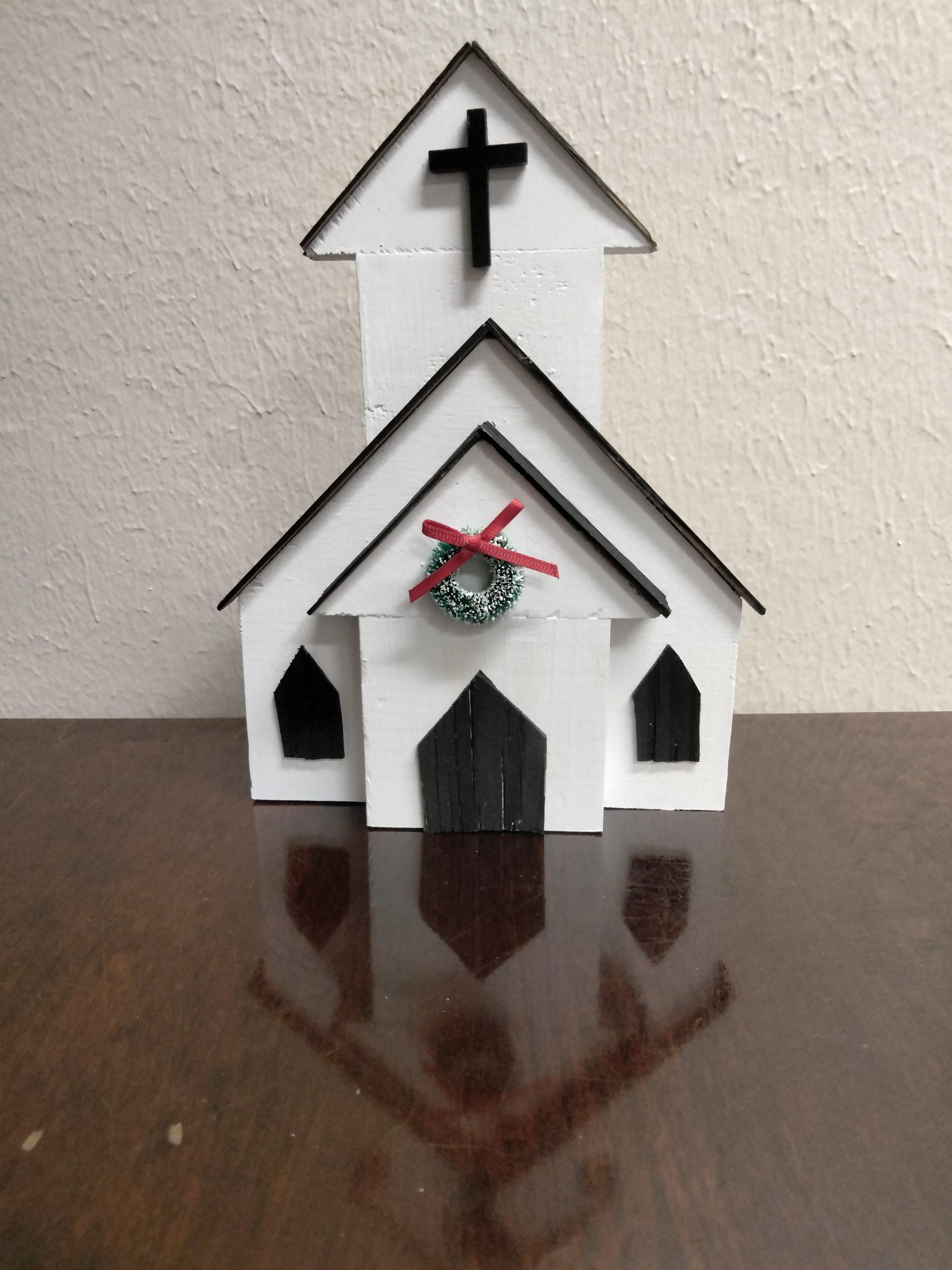 A decoration shaped like a church, with a tiny wreath and a bow. The church is approximately 10″ tall.