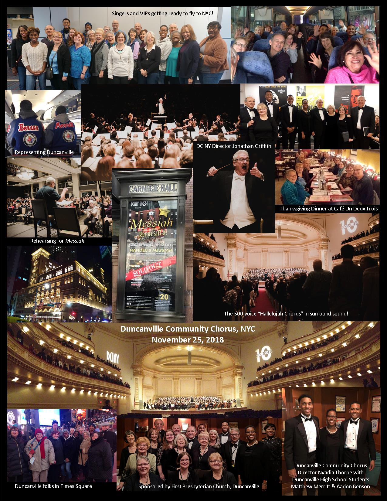 DCINY, the Distinguished Concerts International New York saw this video and used it as an audition. They invited our choir to perform at Carnegie Hall in New York City on November 25, 2018 as part of a group of distinguished singers and musicians. We invited talented singers from the Duncanville area to join our chorus and brought 18 singers and 8 VIPs to Carnegie Hall. Several singers also had family members and friends who came to watch the performance.