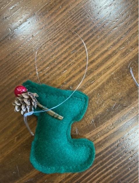 Handmade Felt Green Stocking Ornament, 3″ with ribbon hanger.