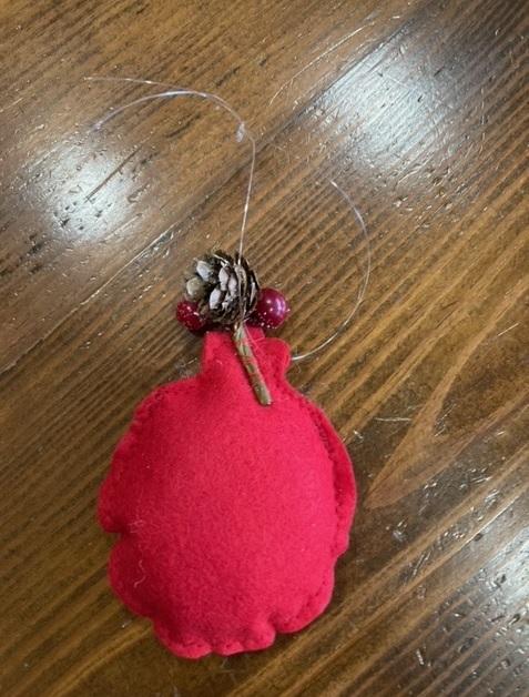Handmade Felt Red Ornament with berries and pinecone ornamentation and hanger.