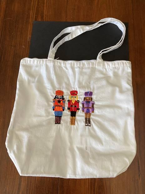 Large zippered tote, 17″ x 18″ (not measuring handles), with wooden soldiers embroidered on one side and candle and bells on the other side.