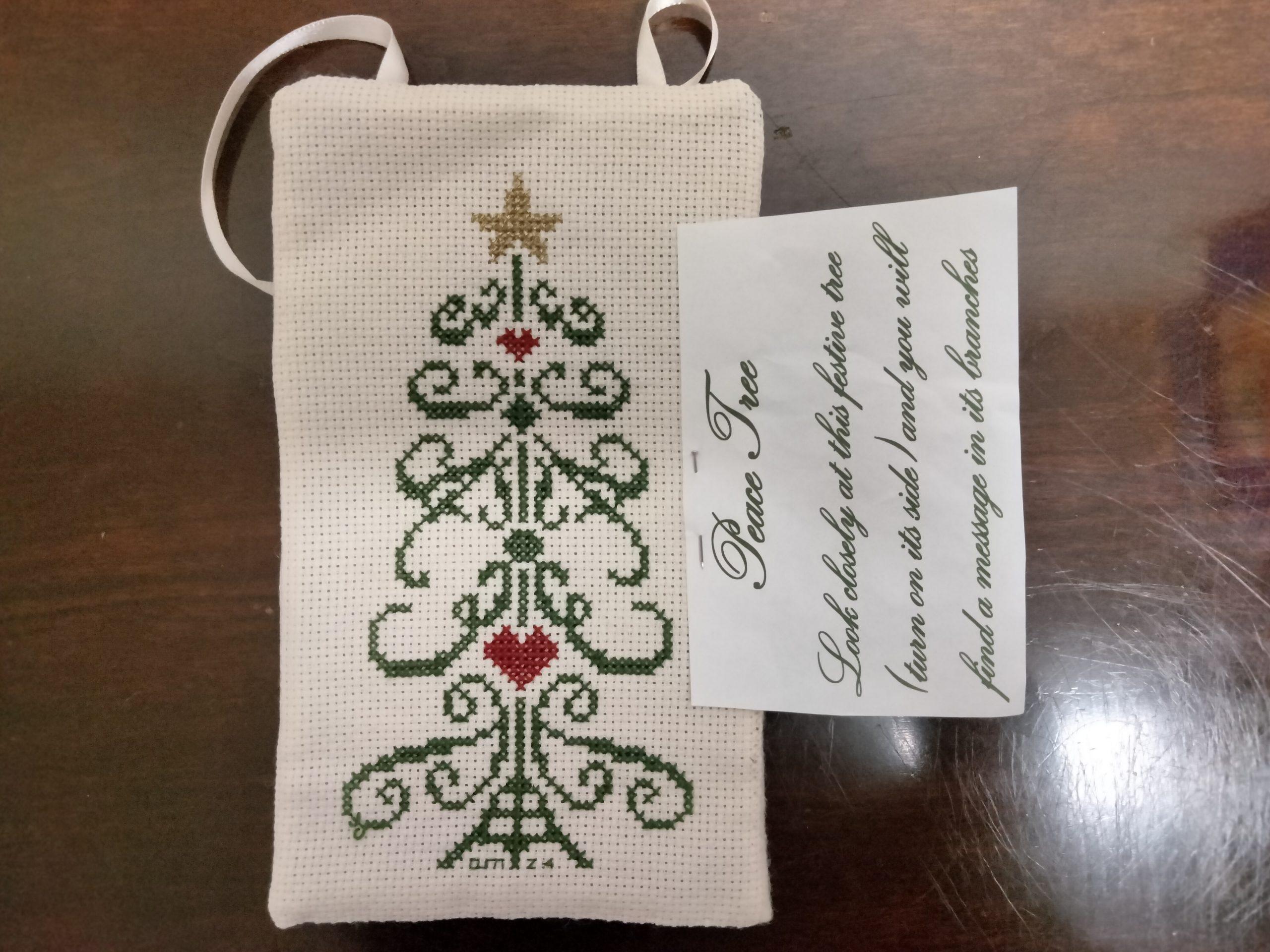 Cross Stitch ornament of a Christmas tree, symbolizing peace