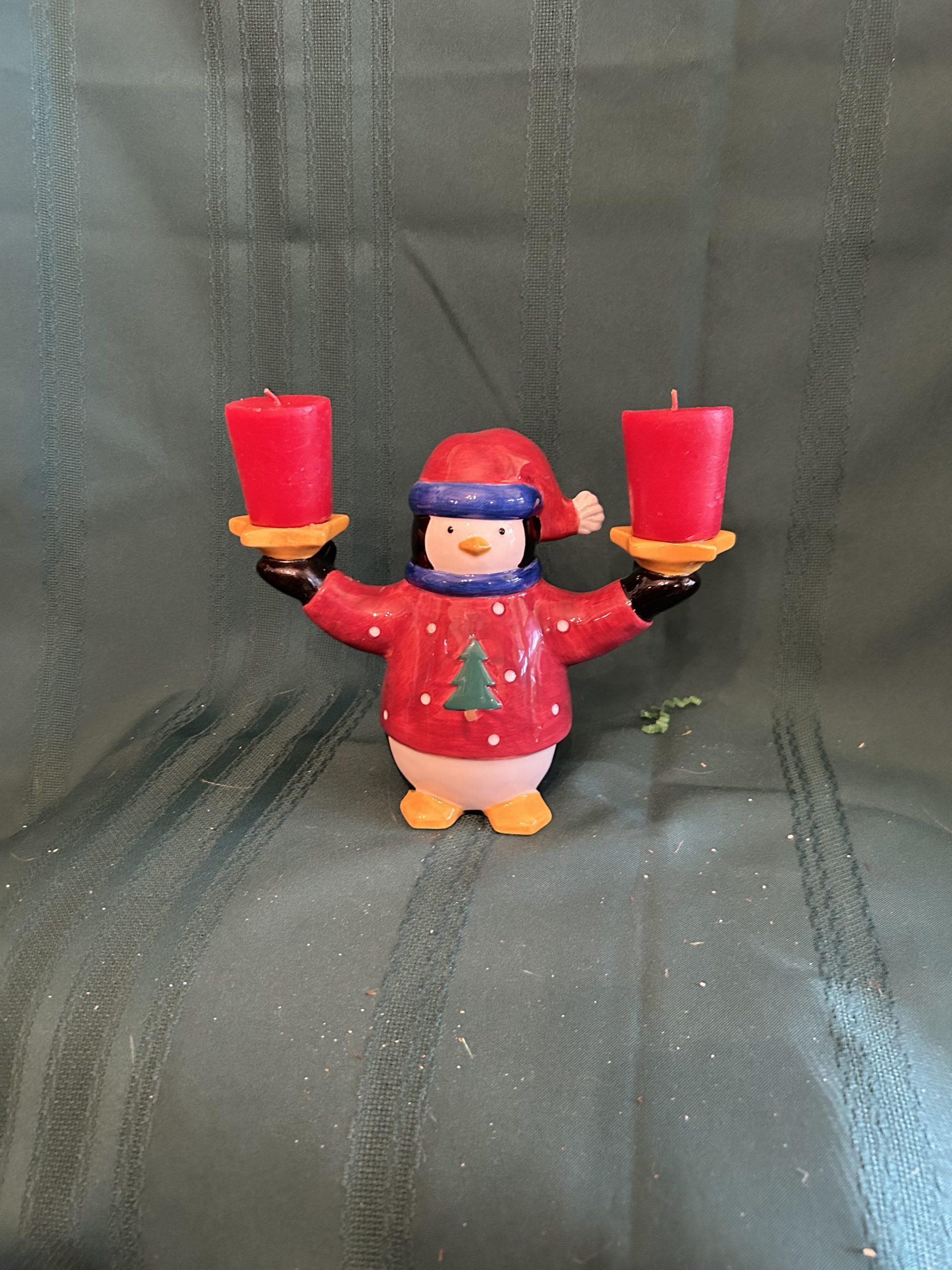 Ceramic Christmas Penguin (7 inches tall) holding two red candles.