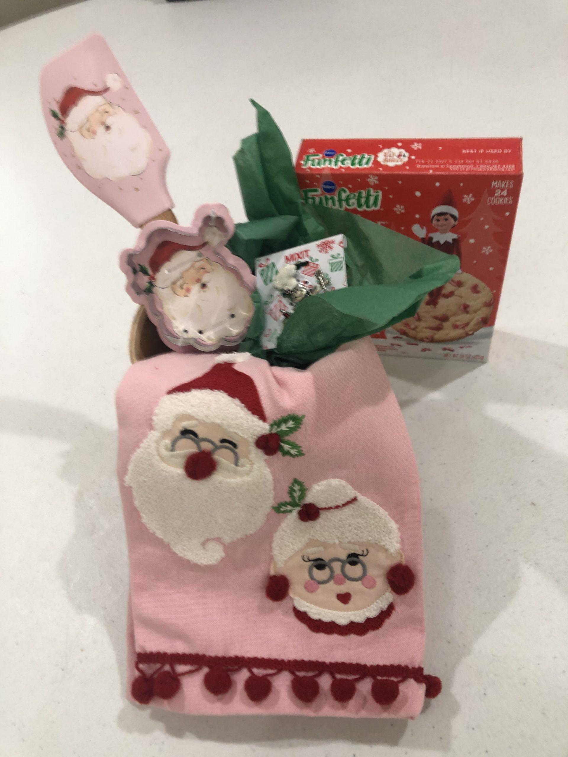 Santa dish towel, mixing spoon and cookie cutter, cookie mix and gingerbread pin
