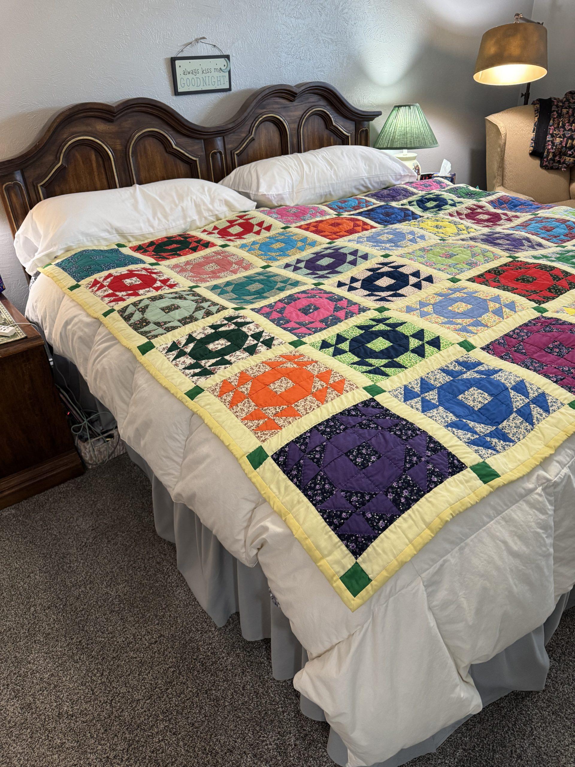 This is a full-size cotton quilt. Its “ Single Wedding Ring” Pattern is a beautiful example of hand craftsmanship. The multitude of colors are perfect to enhance any decor. This historic block, also known as Crown of Thorns, was created around 1890, but was renamed in 1930, probably due to the popularity of the Double Wedding Ring quilt.