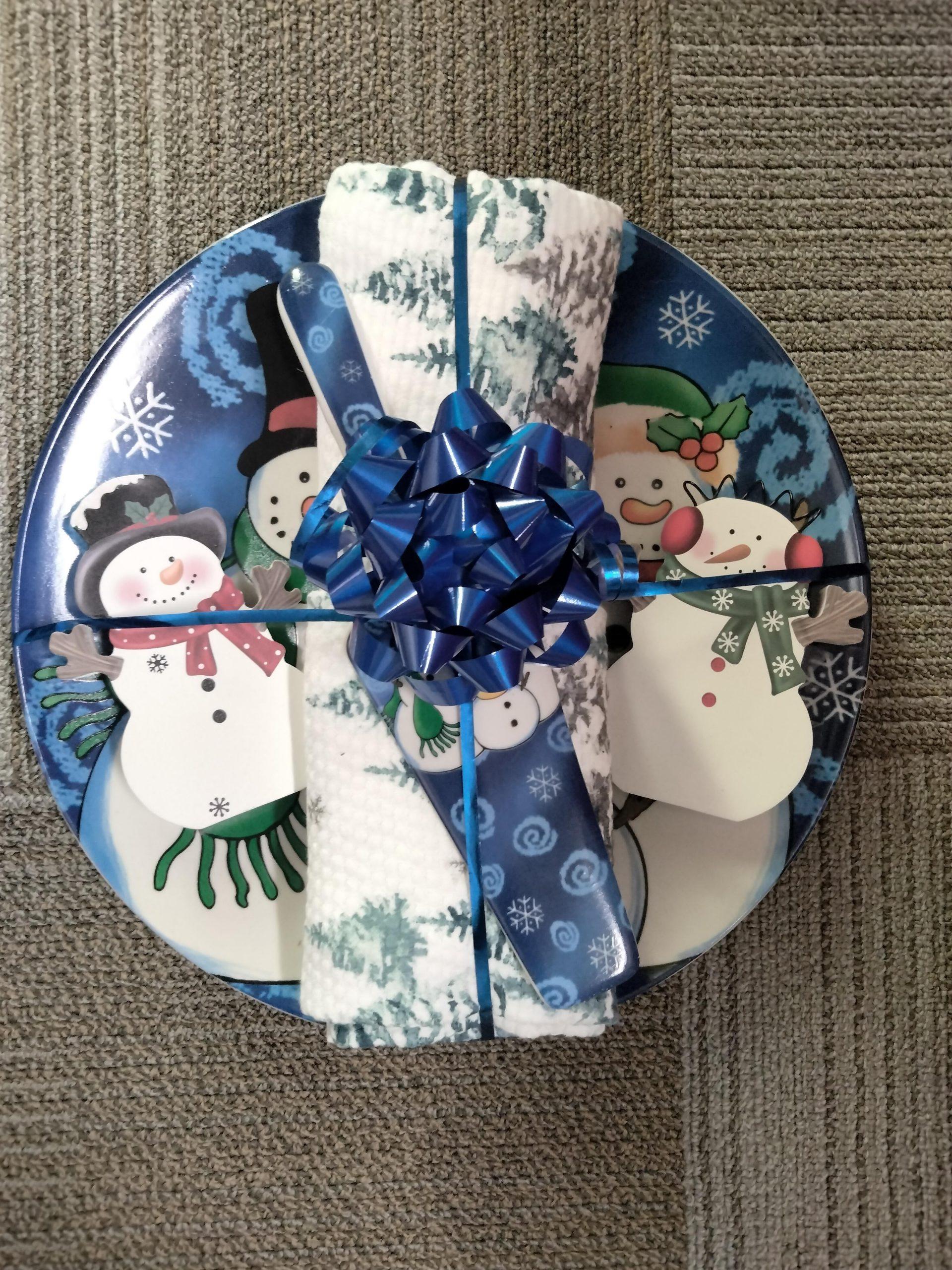12″ snowman cake plate with matching cake server, 2 matching wooden snowman decorations, 2 holiday towels and $25 gift card to Tom Thumb for the cake of your choice!