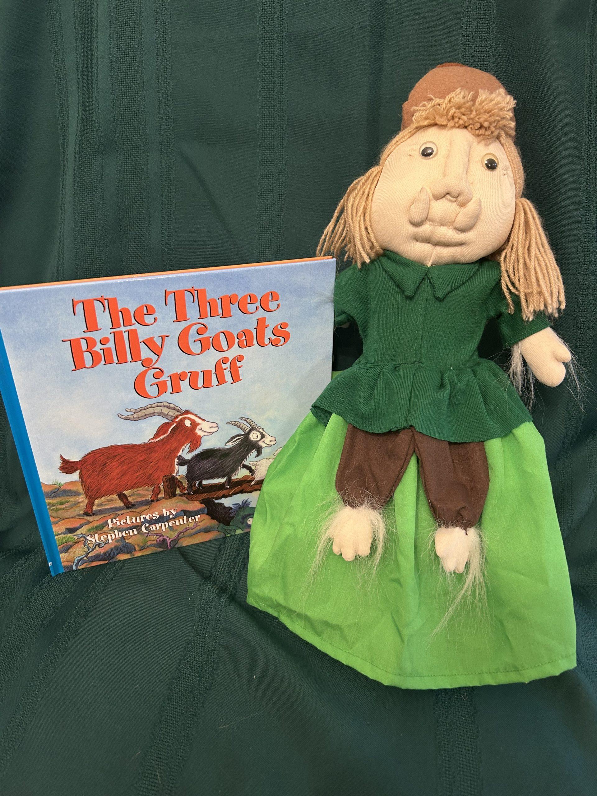 The Three Billy Goats Gruff and the Troll Reversible Storytelling doll. Troll on one side and 3 Billy Goats on the other side. 14” tall. Includes the book.